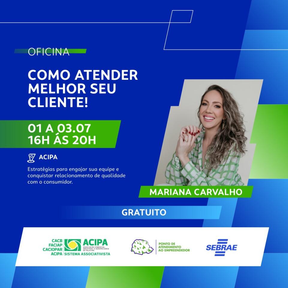 A equipe da Associação Comercial, Industrial e Agropecuária de Palotina (Acipa) anunciou nas redes sociais a realização de mais uma oficina voltada ao desenvolvimento profissional. Com o tema “Como atender melhor seu cliente”, a capacitação será ministrada por Mariana Carvalho entre os dias 1º e 3 de julho, das 16h às 20h, na sede da Acipa, em Palotina.