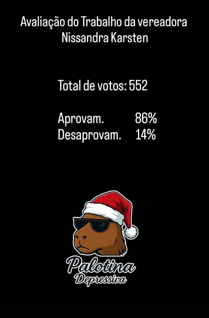 A página Palotina Depressiva, no Instagram, realizou um levantamento sobre a atuação da vereadora de Palotina Nissandra Karsten (PP). A enquete perguntou aos seguidores: “Qual a avaliação do trabalho da vereadora Nissandra Karsten?”.