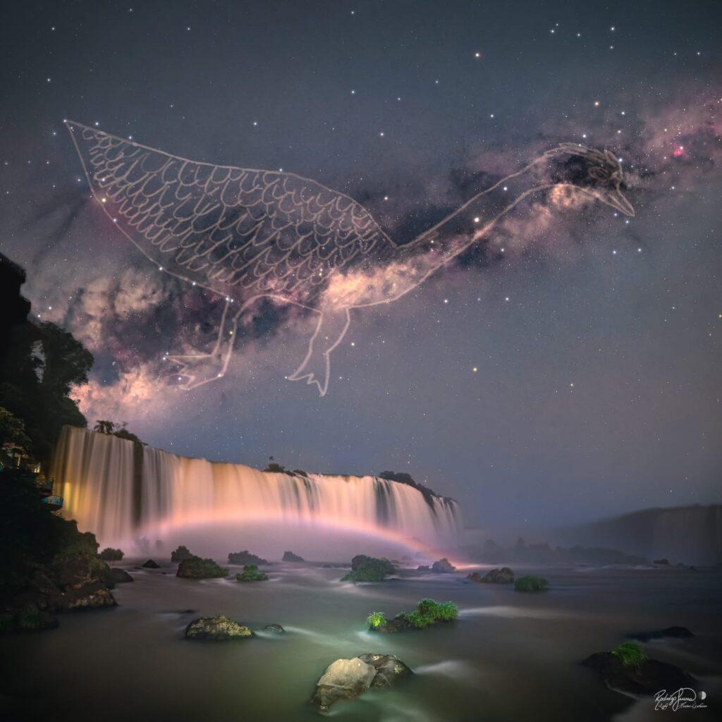 “Ema – Uma Lenda Guarani” – A imagem foi produzida em junho de 2024, período em que, conforme o movimento do céu, a ligação das constelações ocidentais de Escorpião e do Cruzeiro do Sul forma, na visão indígena, o pássaro nativo da América do Sul. A ave aparece atrás das Cataratas do Iguaçu e, com o passar do tempo, sua cabeça se abaixa sobre o Rio Iguaçu. De acordo com os guaranis, o pássaro “bebe toda a água do mundo”.