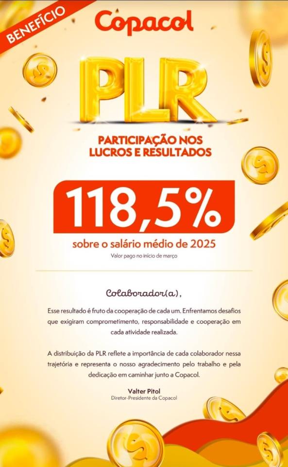 A direção da cooperativa Copacol divulgou nesta sexta-feira (30), por meio das redes sociais, o valor que será repassado aos trabalhadores referente à Participação nos Lucros e Resultados (PLR). Conforme anunciado, o índice definido é de 118,5% sobre o salário médio de 2025, com pagamento previsto para o dia 5 de março, diretamente na conta dos trabalhadores.