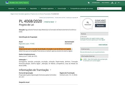 O deputado federal Reginaldo Lopes, do PT de Minas Gerais, apresentou o Projeto de Lei PL 4068/2020, que visa extinguir a produção, circulação e uso do dinheiro em espécie no Brasil. A proposta está atualmente tramitando na Câmara dos Deputados e aguarda parecer do(a) relator(a) na Comissão de Desenvolvimento Econômico (CDE).