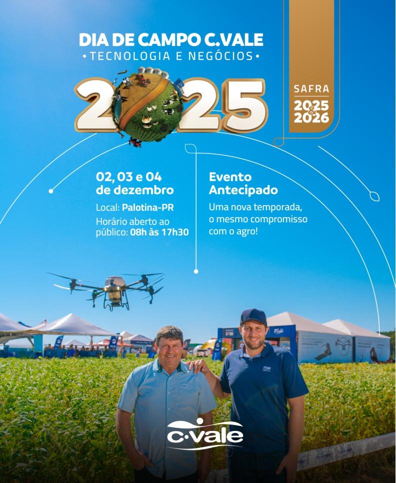 Realizado por décadas no primeiro mês de cada ano, o Dia de Campo da C.Vale, em Palotina (PR), passará a ser realizado em dezembro a partir de 2025. A implantação das lavouras mais precocemente estava fazendo com que o início da colheita da soja no Paraná acontecesse durante o evento técnico da cooperativa, em meados de janeiro. A coincidência de datas dificultava a visitação pelos produtores, o que levou a C.Vale a antecipar o Dia de Campo para o último mês de cada ano a partir de 2025. A primeira edição do evento, nessa nova fase, será dias 2, 3 e 4 de dezembro, ou seja, ainda na primavera.