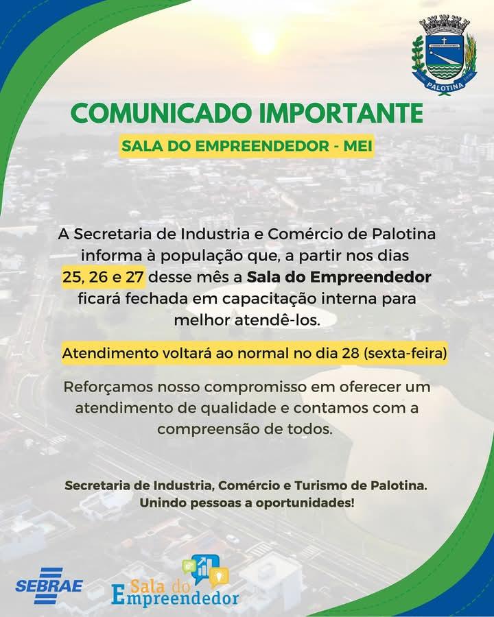 A Secretaria Municipal de Indústria, Comércio e Turismo de Palotina divulgou um importante comunicado à população, informando que a Sala do Empreendedor estará indisponível nos dias 25, 26 e 27 de fevereiro. Essa pausa nos atendimentos se deve à participação da equipe em um treinamento de capacitação, com o objetivo de aprimorar os serviços prestados a empreendedores e comerciantes da cidade. Nesses três dias, o foco estará em adquirir novas habilidades e conhecimentos que poderão ser aplicados para um atendimento ainda mais eficiente e eficaz.