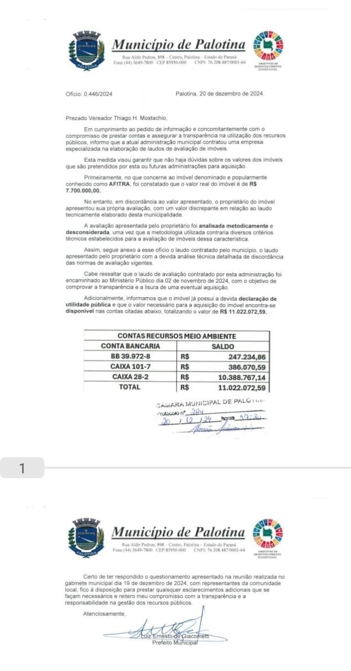 O ex-prefeito Luiz Ernesto de Giacometti enviou um ofício à Câmara de Vereadores de Palotina, destinado ao vereador Thiago Mostachio, que foi eleito presidente do Legislativo, respondendo o pedido de informações sobre o imóvel conhecido como AFITRA. O documento, que reafirma o compromisso com a transparência na gestão pública, traz detalhes sobre a avaliação do imóvel e os recursos disponíveis para sua aquisição.