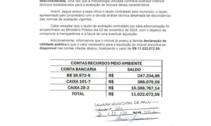 Além disso, Luiz Ernesto destacou que o laudo de avaliação foi encaminhado ao Ministério Público em 2 de novembro de 2024, como parte do compromisso da administração com a transparência e a lisura em uma possível aquisição do imóvel. O ex-prefeito também informou que o imóvel já possui a declaração de utilidade pública, o que facilita o processo de aquisição. Os recursos necessários para a compra do imóvel estão disponíveis em contas específicas, totalizando R$ 11.022.072,59. Os valores detalhados incluem: