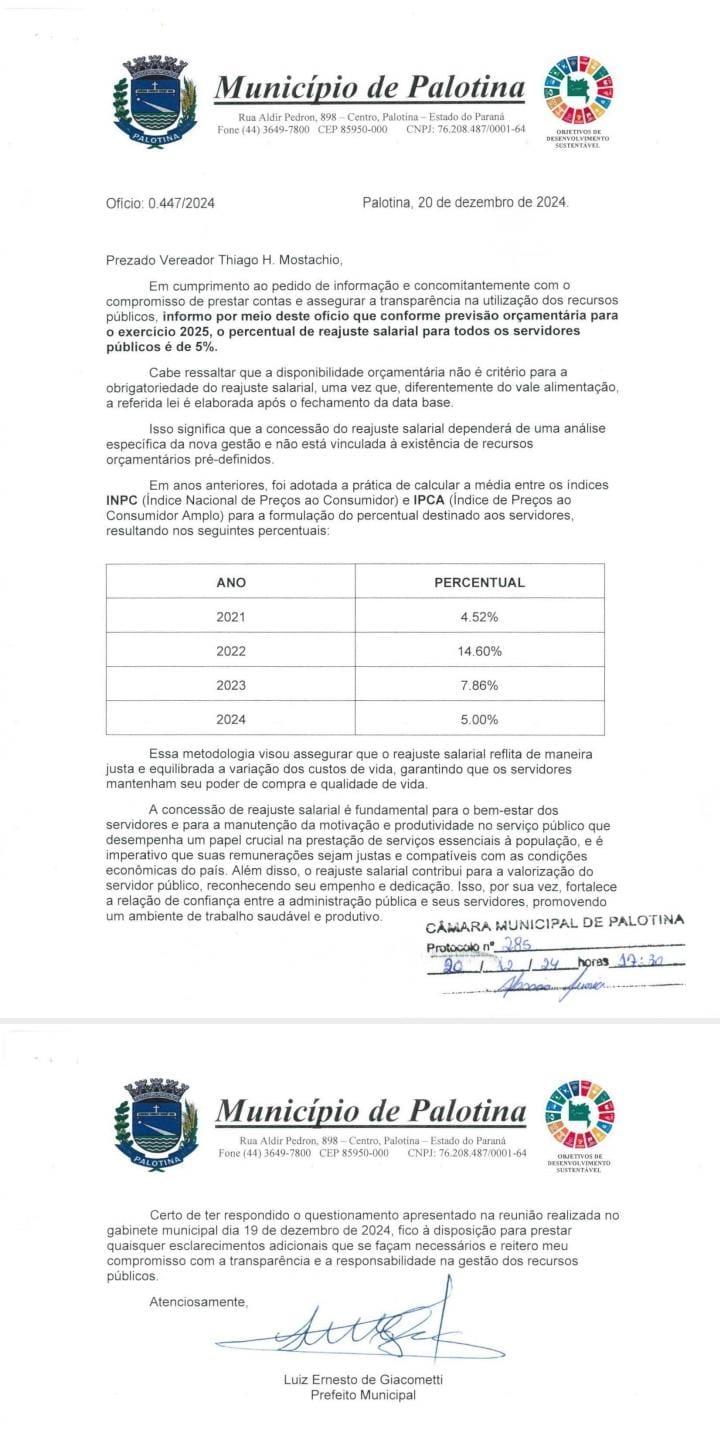 O ex-prefeito de Palotina Luiz Ernesto de Giacometti, em resposta ao pedido de informações do vereador Thiago Mostachio, hoje eleito presidente da câmara municipal para o primeiro biênio, divulgou o Ofício 0.447/2024, que esclarece o percentual de reajuste salarial dos servidores municipais para o exercício de 2025. Segundo o documento, o reajuste previsto no orçamento de 2025 é de 5%.