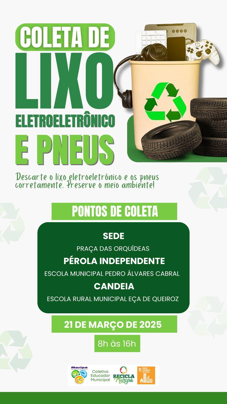 A coleta de lixo eletrônico inclui dispositivos como celulares, computadores, televisores e outros aparelhos que não possuem mais utilidade, mas que contêm substâncias tóxicas, como metais pesados, que devem ser corretamente recicladas. Já os pneus, quando abandonados, são um dos principais focos de proliferação do mosquito Aedes aegypti, além de contribuírem para a poluição visual e para a ocupação irregular de espaços públicos.