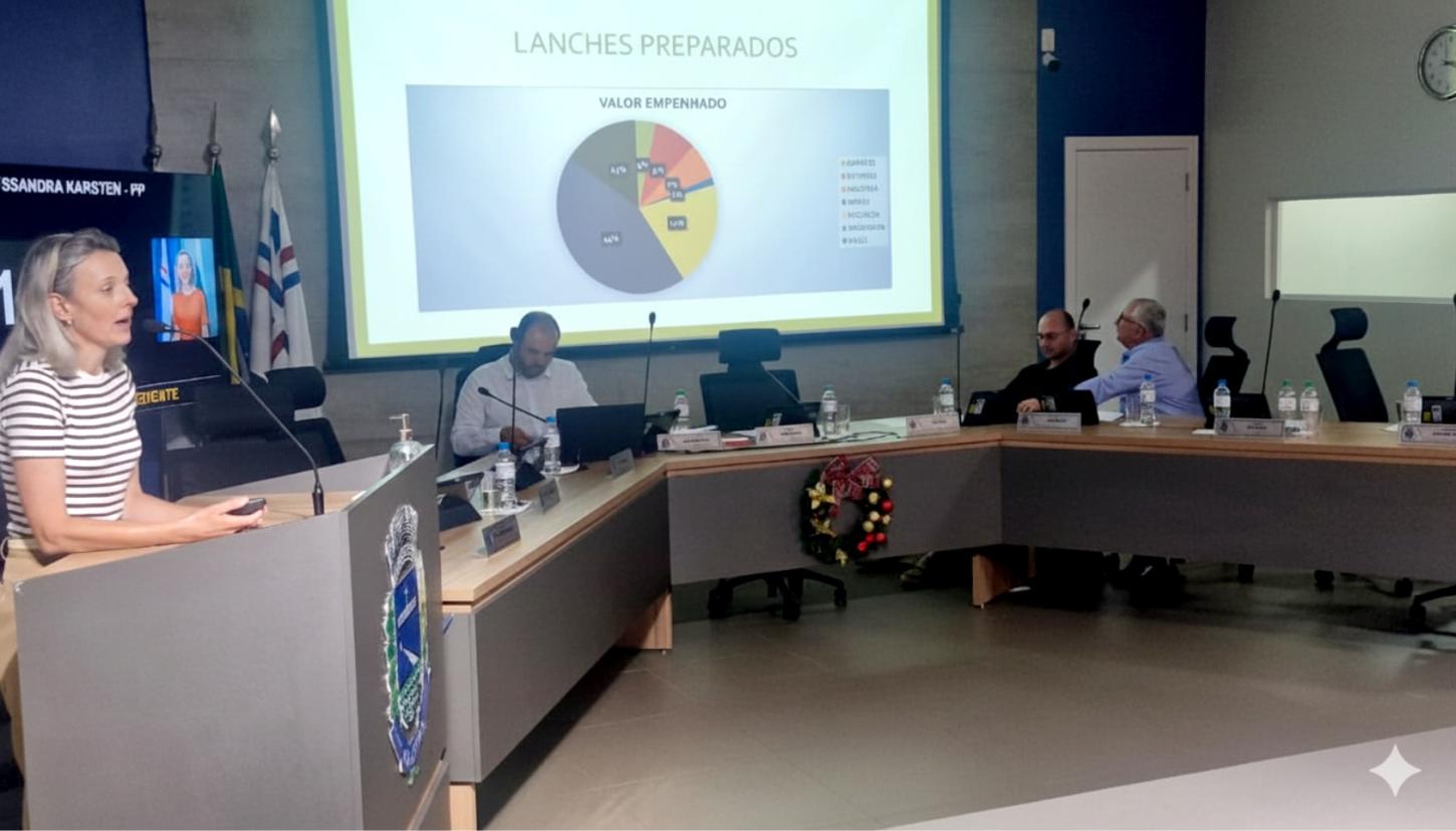 No primeiro ponto, Nissandra revelou informações referentes aos gastos com lanches, os chamados coffee break. Segundo os dados apresentados no telão, o Executivo já empenhou e pagou R$ 202.535,95. A divisão por secretarias aponta: Gabinete (R$ 8.401,17), Esportes (R$ 17.173,12), Indústria, Comércio e Turismo (R$ 14.026,54), Agricultura (R$ 2.950,67), Educação e Cultura (R$ 40.831,90), Assistência Social (R$ 88.363,92) e Saúde (R$ 30.788,63). A vereadora destacou que o maior volume está na Assistência Social, representando cerca de 44% do total.