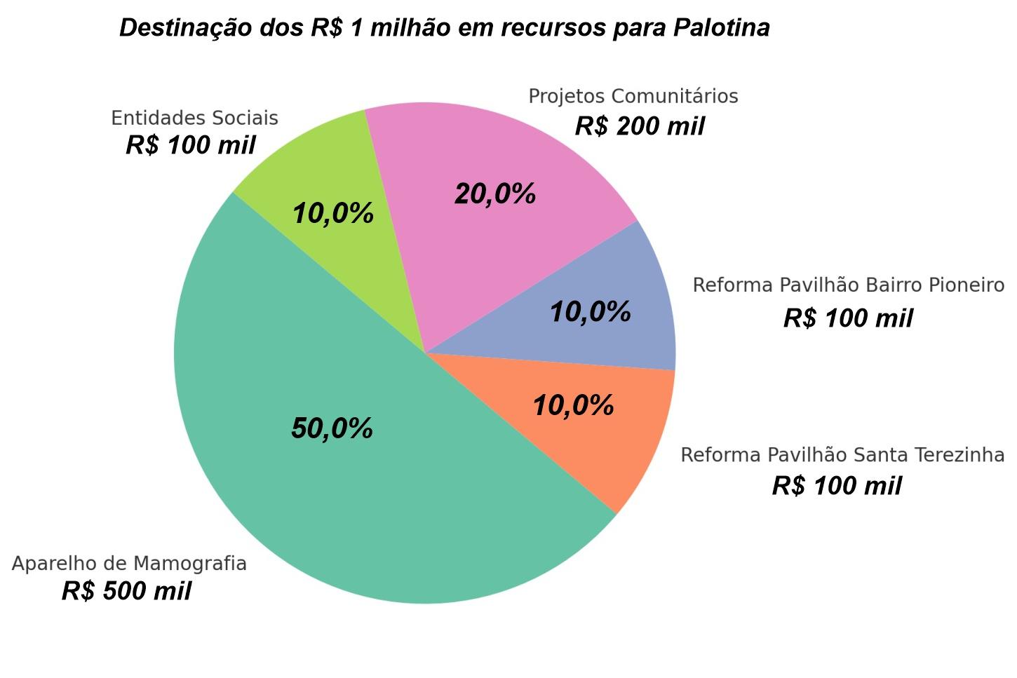 Segundo informações divulgadas, a maior parte do recurso — R$ 500 mil — será destinada à compra de um novo aparelho de mamografia para o Hospital Municipal de Palotina. O investimento terá ainda uma contrapartida de R$ 350 mil do próprio município, oriundos de emendas parlamentares dos vereadores. Além da área da saúde, a infraestrutura comunitária também será beneficiada. Estão previstos R$ 100 mil para a reforma do pavilhão da comunidade Santa Terezinha e outros R$ 100 mil para melhorias no pavilhão do Bairro Pioneiro.