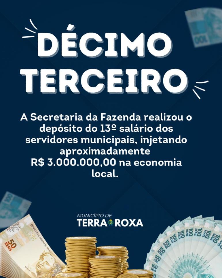 A Prefeitura de Terra Roxa realizou o depósito do 13º salário dos servidores municipais, assegurando a injeção de aproximadamente R$ 3 milhões na economia local. O valor representa um impulso significativo para o comércio e os serviços do município, especialmente neste período do ano, quando o movimento financeiro aumenta e as famílias se organizam para as festividades de fim de ano.