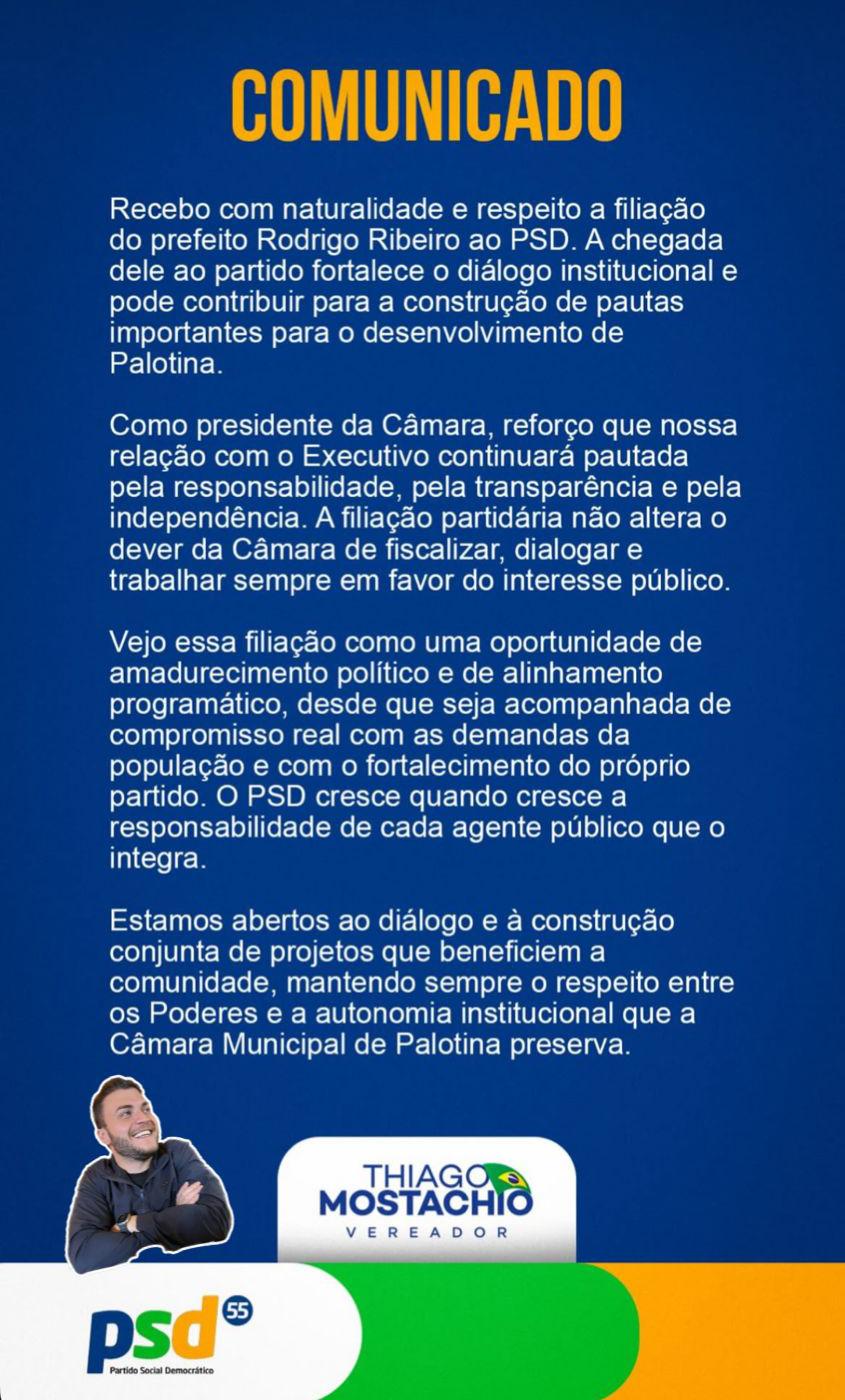 Na manifestação, Mostachio afirmou receber “com naturalidade e respeito” a mudança partidária do chefe do Executivo. Segundo ele, a chegada de Ribeiro ao PSD pode ampliar as condições para “fortalecer o diálogo institucional e contribuir para a construção de pautas importantes para o desenvolvimento de Palotina”.