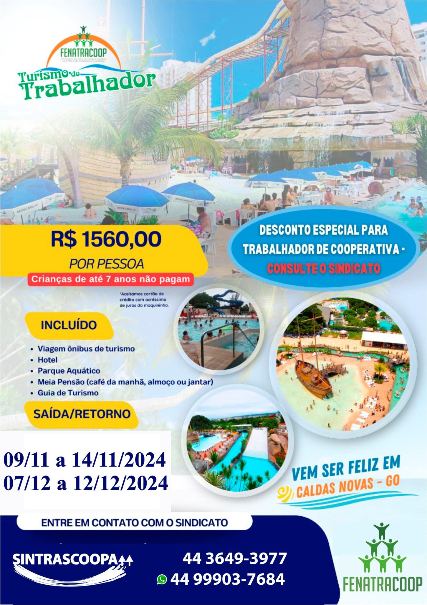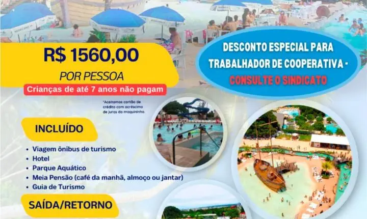 Com a finalidade de proporcionar condições para que os trabalhadores em cooperativas sindicalizados, possam participar do programa de férias Turismo do Trabalhador, a direção do sindicato Sintrascoopa, vai disponibilizar 20 pacotes do programa com um super desconto. Essa é a sua oportunidade de passar momentos agradáveis em companhia da sua família e amigos em Caldas Novas-GO, pagando R$ 800,00 por pessoa, com transporte, hotel, alimentação e parque aquático incluso!