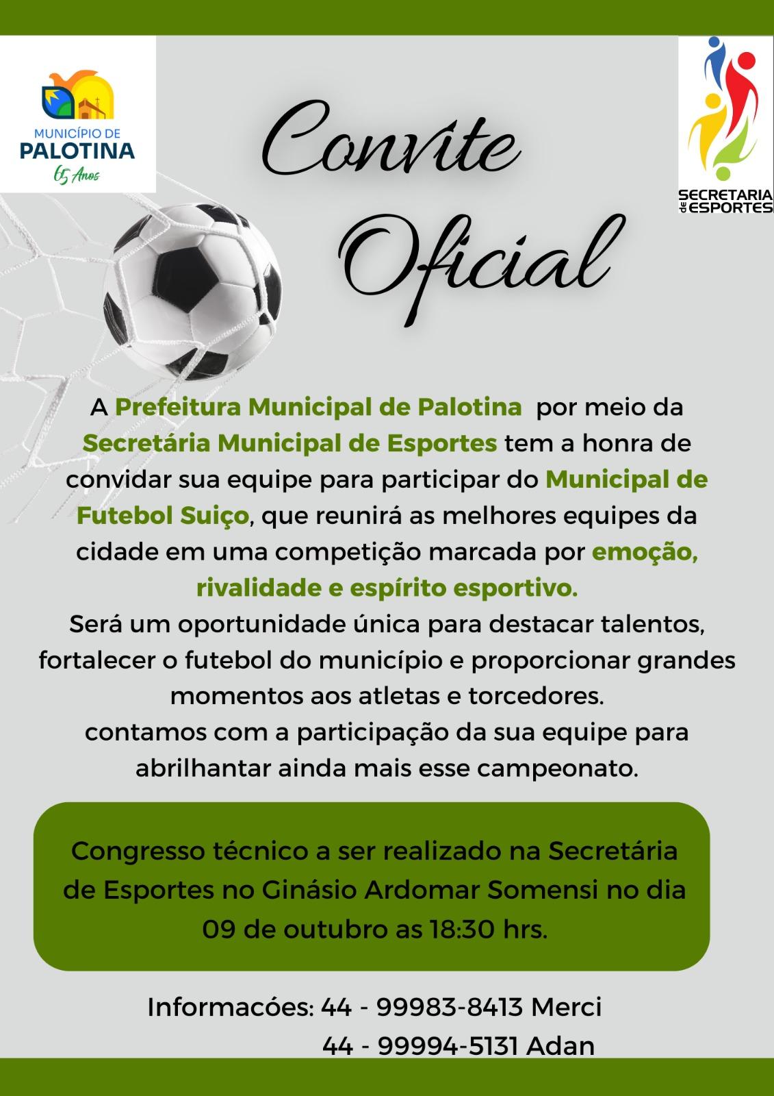 A Secretaria Municipal de Esportes de Palotina divulgou nas redes sociais um convite especial aos representantes de equipes interessadas em participar do Campeonato Municipal de Futebol Suíço. O Congresso Técnico está marcado para o próximo dia 9 de outubro, a partir das 18h30, na sede da Secretaria de Esportes, localizada no Ginásio Ardomar Somensi.