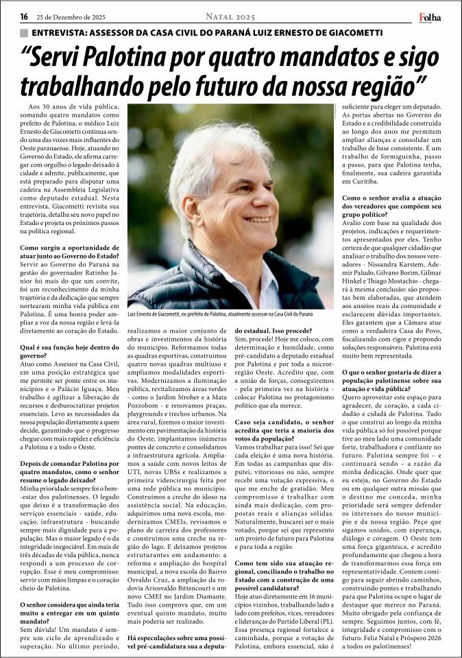 O ex-prefeito de Palotina e atual Assessor Regional da Casa Civil do Governo do Estado, Luiz Ernesto de Giacometti, confirmou publicamente sua pré-candidatura a deputado estadual e avaliou sua atuação no Executivo paranaense, o legado construído ao longo de quatro mandatos como chefe do Executivo municipal e os planos para o futuro político. As declarações foram feitas em entrevista concedida à edição especial de Natal do jornal Folha de Palotina, que circulou nesta terça-feira (23).