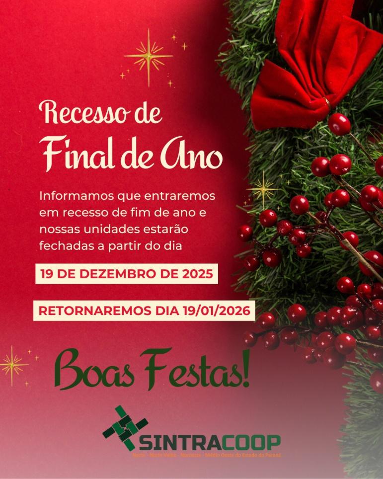 O dirigente sindical responsável pelas atividades do Sintracoop Toledo, Anderson de Castro de Souza, e o delegado sindical Marcos, ressaltam que o período de fim de ano é essencial para renovar as energias. O sindicato informa que entrará em recesso de 19 de dezembro de 2025 a 19 de janeiro de 2026.