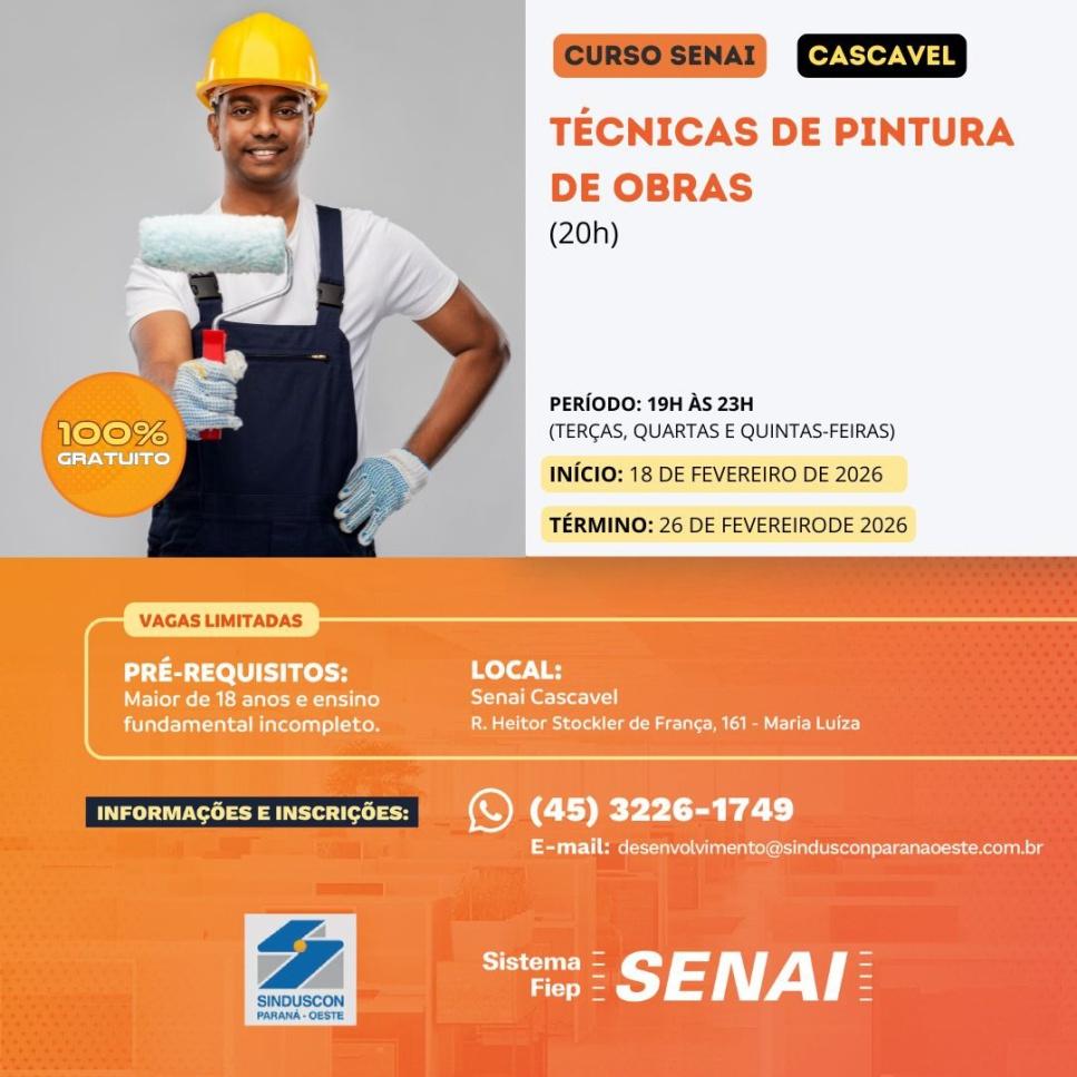 O Sinduscon Paraná Oeste abriu inscrições para o curso de "Técnicas de Pintura de Obras", oferecido em parceria com o Senai-PR. A iniciativa, que visa capacitar profissionais do setor, terá turmas gratuitas em Cascavel, Foz do Iguaçu e Toledo, o que reforça o compromisso do sindicato com a qualificação da mão de obra na região. O curso, com carga horária total de 20 horas, é totalmente gratuito para os interessados que preencham os pré-requisitos básicos: ser maior de 18 anos e possuir ensino fundamental incompleto.