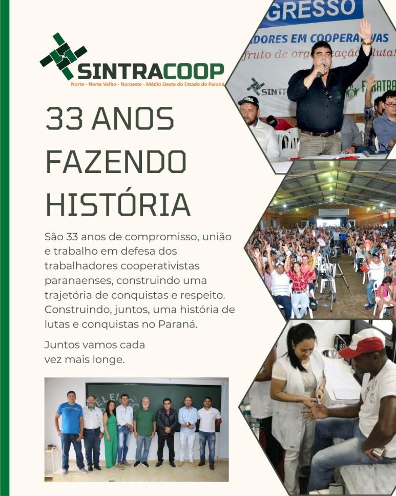 Neste sábado, dia 13 de dezembro, o Sindicato dos Trabalhadores Celetistas em Cooperativas do Estado do Paraná (Sintracoop-PR) celebra 33 anos de existência, marcados por uma trajetória de pioneirismo, seriedade e atuação firme na defesa dos direitos dos trabalhadores em cooperativas.