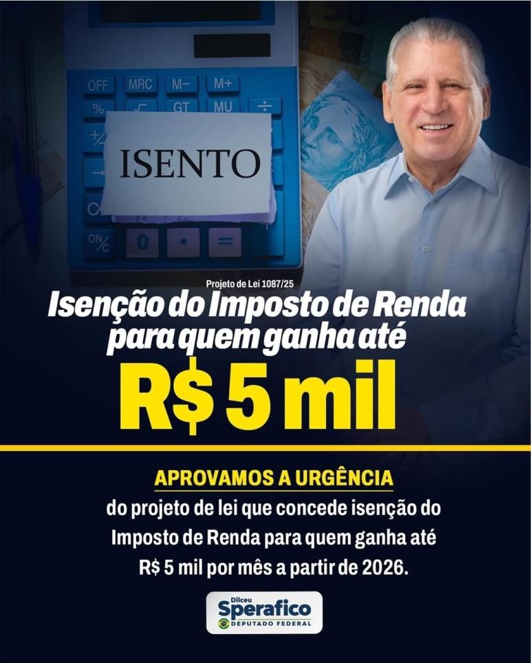 O deputado federal Dilceu Sperafico (União Progressista-PR) comemorou em suas redes sociais a aprovação do regime de urgência para o Projeto de Lei 1087/25, do Poder Executivo, que concede isenção de Imposto de Renda (IR) para contribuintes com renda mensal de até R$ 5 mil. Com a urgência, a tramitação será acelerada e a matéria deve ser analisada diretamente em Plenário. Agora, o presidente da Câmara dos Deputados, Hugo Motta (Republicanos-PB), vai definir com os líderes partidários a data para a votação da versão apresentada pelo relator, deputado Arthur Lira (União Progressista-AL).